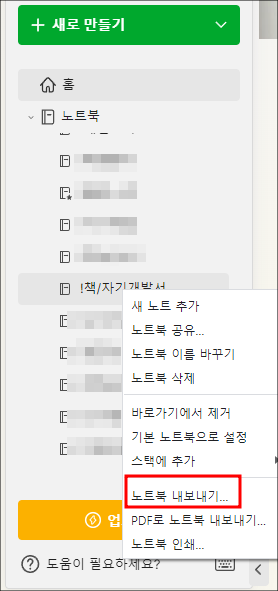 먼저, 에버노트에서 업노트로 옮기고 싶은 노트북을 선택합니다. 마우스 오른쪽키를 눌러 노트북 내보내기를 선택합니다.
