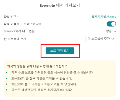 업노트를 실행합니다. 설정에서 일반 > 에버노트 가져오기를 선택합니다. 파일선택에서 'enex'파일 선택을 합니다.