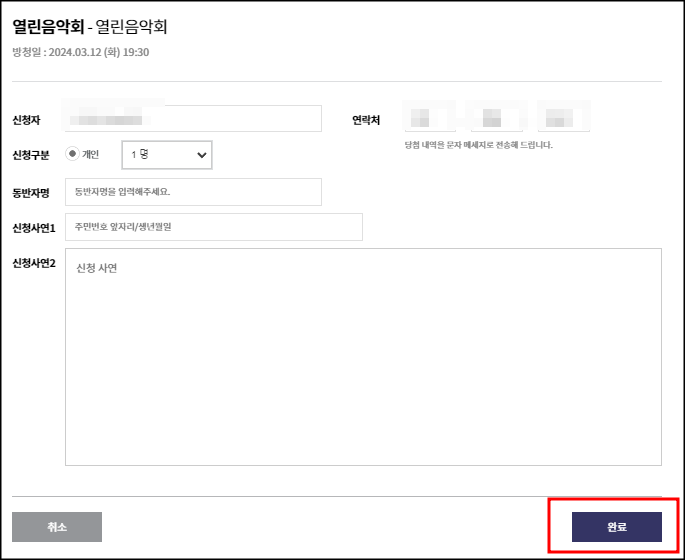 동반인의 성명까지 정확하게 기입하셔야 합니다. 성명이 틀릴 경우 티켓수령이 불가합니다. 열린 음악회 관련 문의는 02-781-1000으로 하실 수 있습니다.