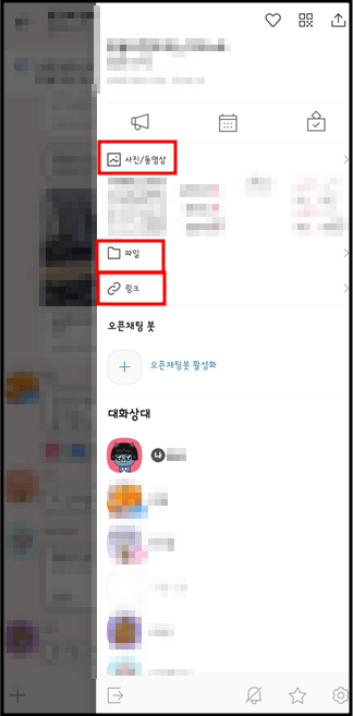 4. 부가적으로 줄3개 누르면 나오는 메뉴 보시면 사진, 파일 링크가 있는데요. 그룹채팅방에서 전에 올려졌던 사진, 파일, 링크를 힘들게 다시 위로 올리면서 일일이 찾을 필요 없이 오른쪽 사진, 파일, 링크를 누르면 아주 쉽게 찾으실 수 있습니다.