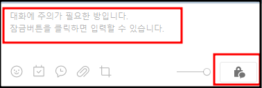 4. 그럼 다시 채팅방으로 돌아왔을 때 채팅글 쓰는 곳에 아래와 같이 대화에 주의가 필요한 방입니다. 잠금버튼을 클릭하면 입력할 수 있습니다. 메시지가 뜹니다. 글을 쓸 때는 자물쇠 그림을 눌러주시면 채팅 글을 쓰실 수 있습니다. 이제 안심하고 채팅을 하세요.