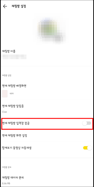 3. 톱니바퀴 모양을 누르면 채팅방 설정메뉴가 뜨는데요. 거기서 현재 채팅방입력창 잠금을 활성화시켜 주세요.