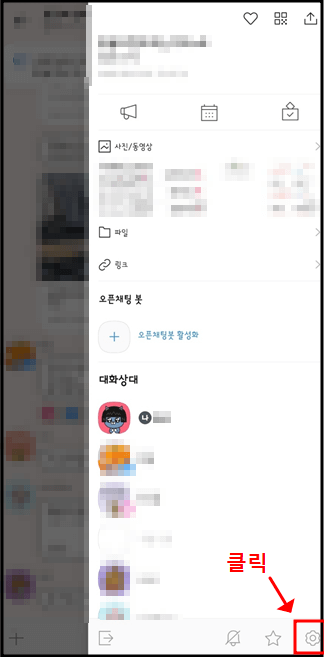 3. 톱니바퀴 모양을 누르면 채팅방 설정메뉴가 뜨는데요. 거기서 현재 채팅방입력창 잠금을 활성화시켜 주세요.