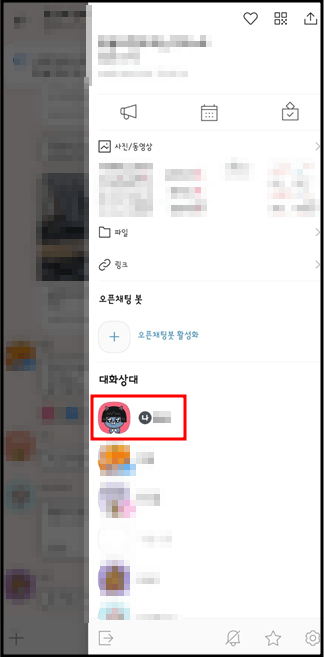 2. 그럼 오른쪽그림처럼 메뉴가 뜨는데요. 거기서 대화상대 제일 첫 줄이 내 프로필입니다. '나'라고 쓰여있습니다.