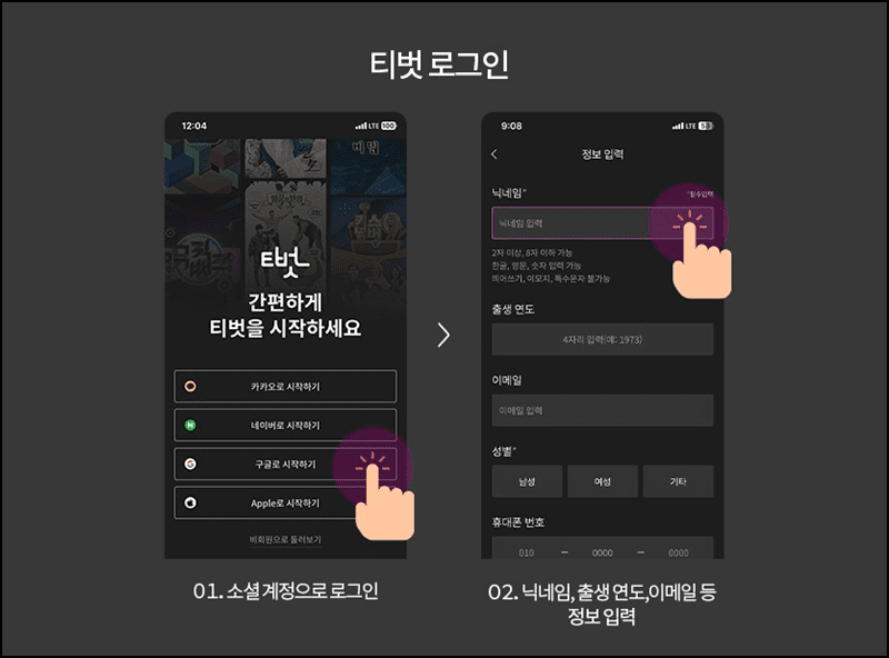 회원가입이 안되어 계신 분들은 시작하기를 누르시면 정보입력 창이 뜰 것입니다. 닉네임은 원하시는 아무 이름을 기입하시고, 출생연도, 이메일주소, 성별선택, 휴대폰 번호 입력등 차례대로 다 입력을 해줍니다.