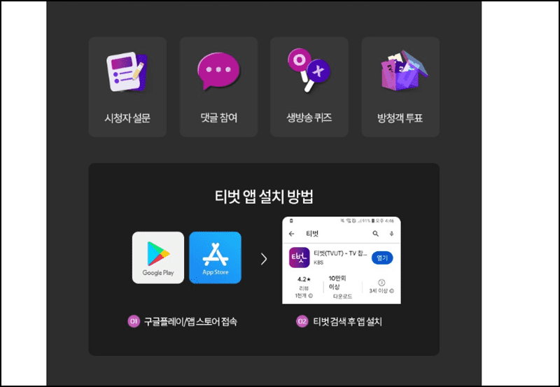 아침마당에서 퀴즈 문제를 낼 때, 시청자 참여프로그램에 대한 내용이 나올 때 티벗, 티벗이라고 계속 얘기하는데 도대체 티벗이 무엇인지 궁금하셨죠? 티벗을 설치하고 사용하실 수 있도록 바로 안내해 드릴게요. 먼저 티벗 가입방법에 대해 아침마당에서 알려주는 설명을 보실 수 있도록 안내해드릴게요.